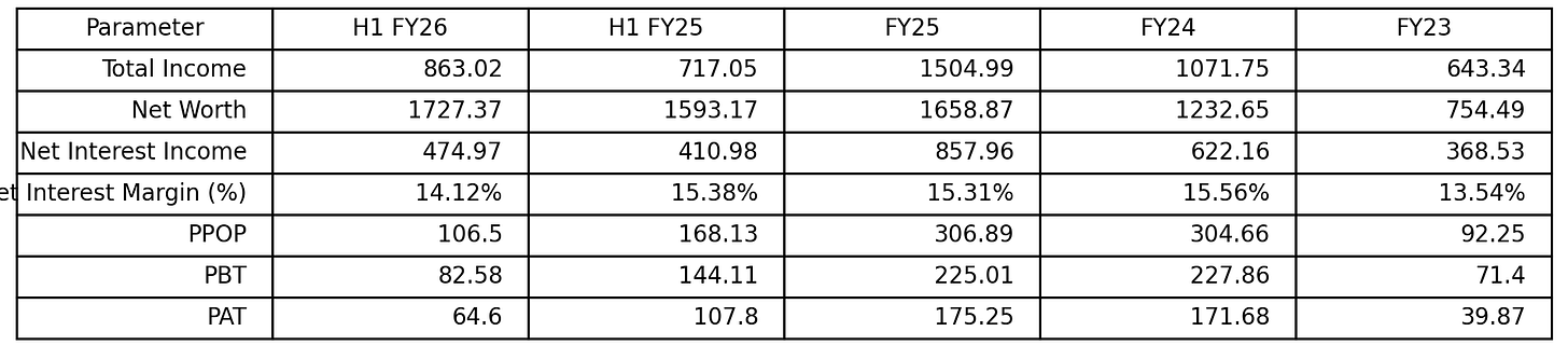Profit After Tax (PAT): Profitability has scaled meaningfully over the last three years. PAT increased sharply from Rs 39.87 crore in FY23 to Rs 171.68 crore in FY24, a more than 4x increase, driven by operating leverage. In FY25, PAT further rose to Rs 175.25 crore, indicating stable earnings. In H1 FY26, PAT stood at Rs 64.60 crore, compared to Rs 107.80 crore in H1 FY25, reflecting a YoY decline, primarily due to higher credit costs and margin normalization.