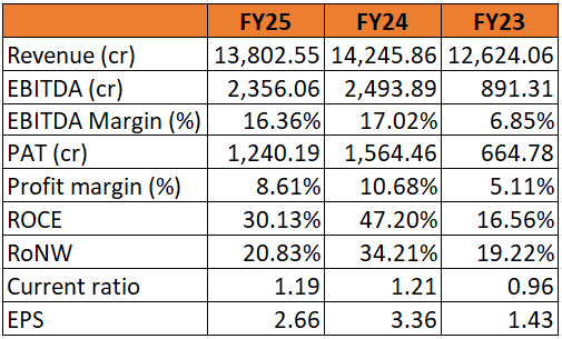 Profit peaked in FY24 and cooled off in FY25. PAT more than doubled from FY23 to FY24, showing a sharp improvement in operating efficiency and margins. The decline in FY25 suggests margin pressure or higher costs, not a breakdown in the business model.