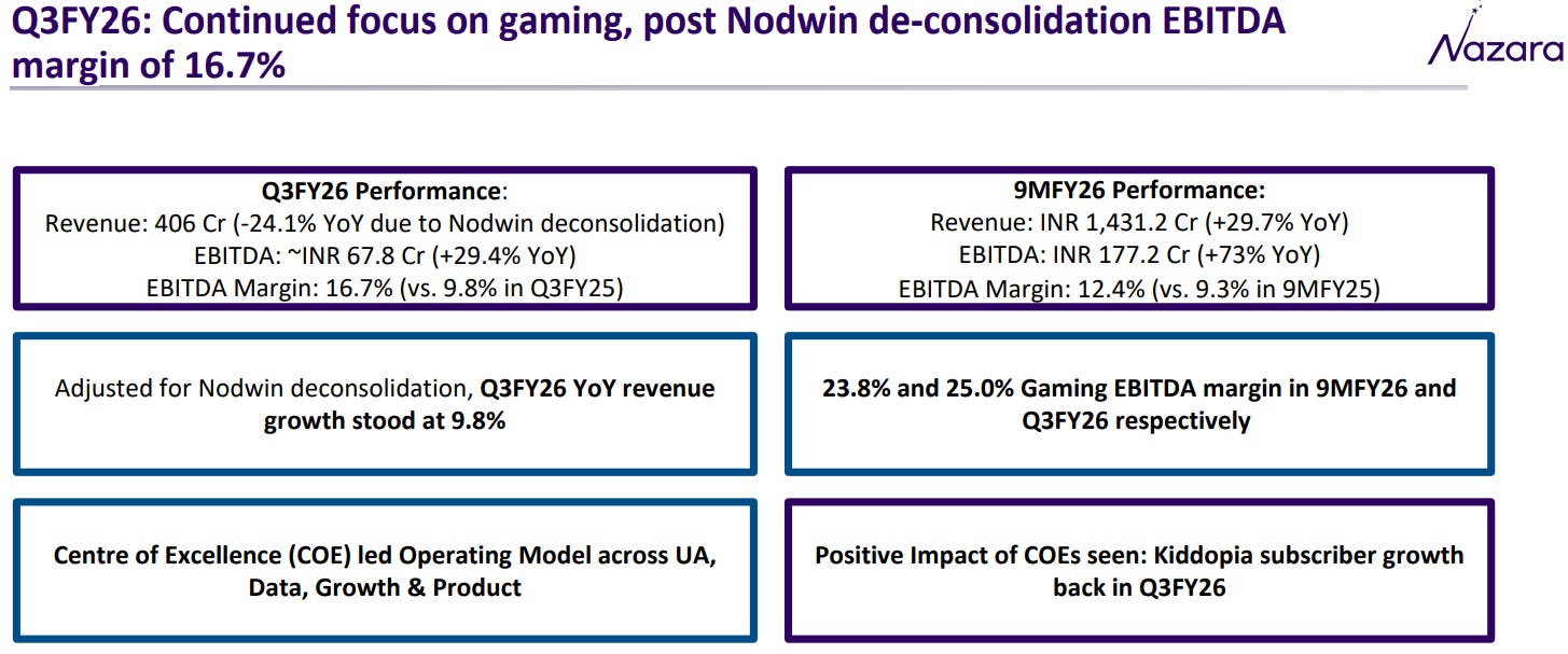 In Q3FY26, Nazara delivered revenue of Rs 406 crores, with an EBITDA of Rs 67.8 crores, up 29.4% YoY and margins expanding to 16.7%.
