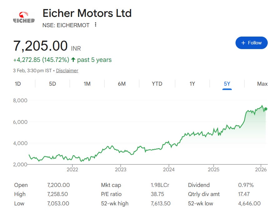 Eicher rewarded patience, not activity. The biggest gains went to those who stayed invested long enough to experience multiple growth cycles, rather than those who traded around short-term noise.
