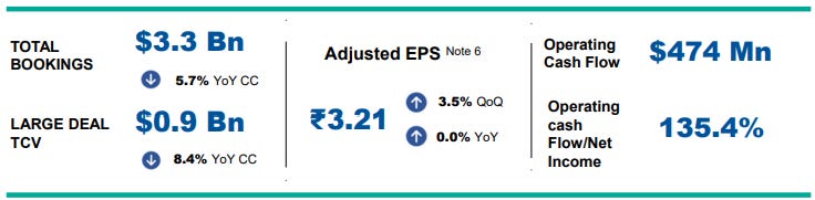 Total bookings were at Rs 26,680 crore, down 5.7% YoY in constant currency.