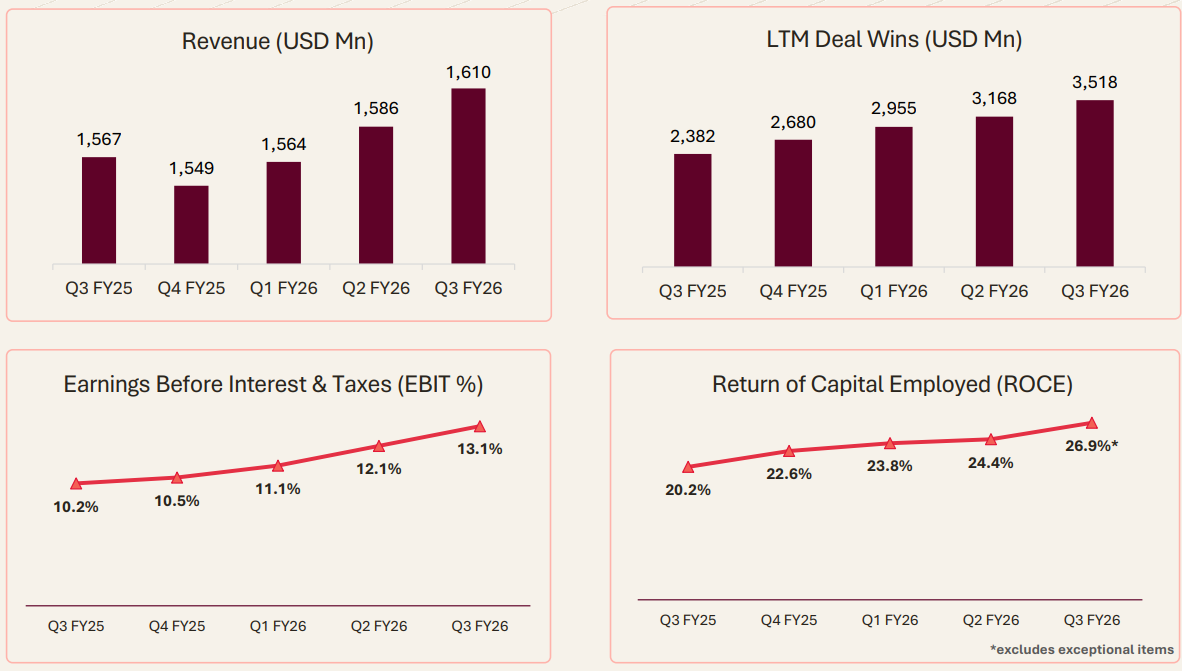 Revenue: Reached Rs 14,393 crore, showing growth of 2.8% QoQ and 8.3% YoY. In USD terms, revenue stood at $1,610 million.